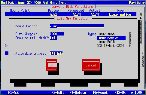 Mount Point -- Highlight this field and enter the partition's mount point. For example, if this partition should be the root partition, enter /; enter /usr for the /usr partition, and so on.