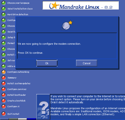 An alert window is displayed when the installer is ready to begin configuring the modem connection.