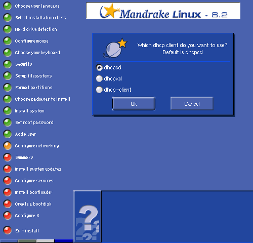 In an "Expert" installation, several types of dhcp clients can be chosen; "dhcpcd" is the default selection.