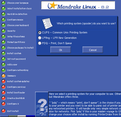 CUPS is the default printing system for Mandrake Linux 8.2, but other options are also available.