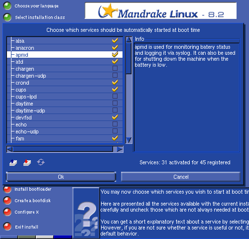 Click the mouse on a service name for a description of that service; click on the checkbox to enable or disable a service.