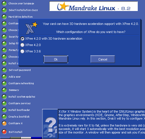 XFree 4.2 is the default video server for Mandrake 8.2, but the older XFree 3.3 is still available.