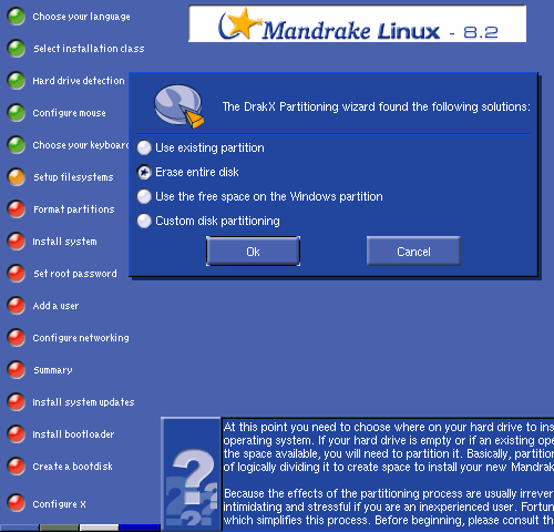 The easiest partitioning solution is to erase the entire disk, but this means that ALL existing partitions and their data will be lost.
