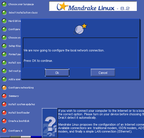 An alert window is displayed when the installer is ready to begin configuring the local network connection.