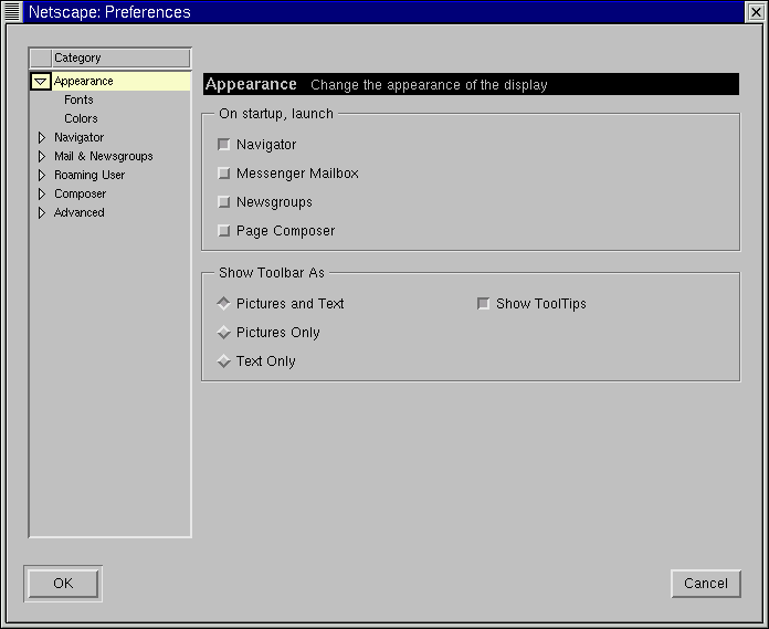 Appearance -- Allows you to modify the way Navigator physically appears, such as the colors or use of icons on the navigation bars.