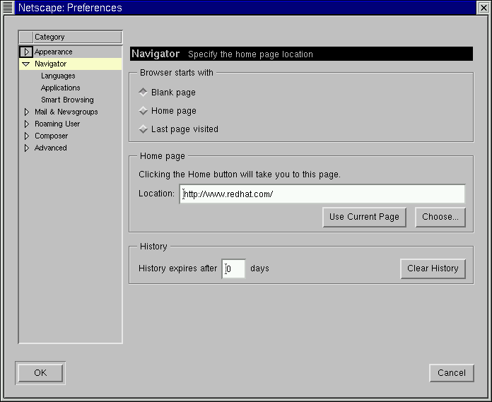 Navigator -- Among other things, lets you specify your Home page, or the page you see when the browser starts. Also allows you to modify how long to keep previously visited sites in a history, for quick viewing later.