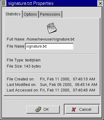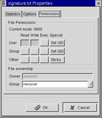 Essentially, these items refer to user management and permissions. UID means User ID, a unique number given to every user on the system; GID means Group ID, the ID of the user's default group. Sticky refers to Sticky bit. You probably won't have to worry about setting the Sticky bit. For more about how to work with permissions, see the section called Ownership and Permissions in Chapter 13. Once you understand the idea behind file permissions, you may find using the Permissions tab a convenient way to change a file or directory's permission settings. |