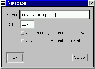 The procedure for entering the newsgroups server is somewhat similar to entering account information for e-mail services. In this instance, you must enter the name of the server to which you'll connect for access to newsgroups. Your ISP should provide you with this information.