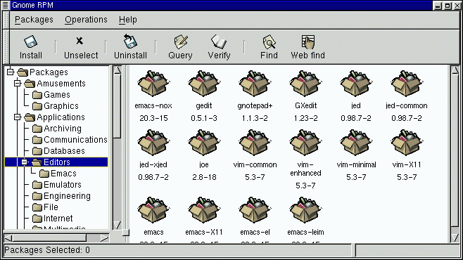 To select a single package, click on it with the left mouse button. You'll notice that highlighting will appear around the package's title (as shown in Figure 10-2). To unselect it, either click on an empty space in the display panel with the left mouse button, or click on the Unselect button on the toolbar.